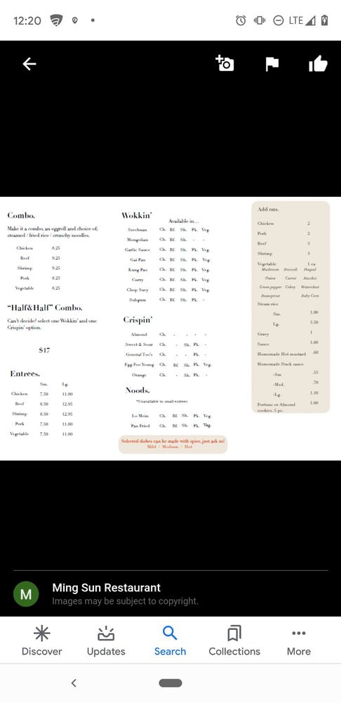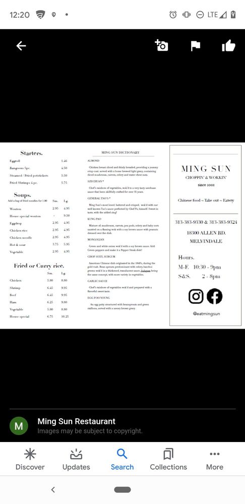 Ming Sun Restaurant in Melvindale, MI offers a delightful Chinese dining experience with a wide range of menu options. Customers rave about the generous portions and delicious flavors, with favorites like Chinese vegetable soup and beef with vegetables standing out. The friendly staff and welcoming atmosphere make every visit a pleasant experience. Whether you're dining in or taking out, Ming Sun Restaurant ensures that you'll leave satisfied and eager to return. With 15 years of establishment in the same location, this restaurant has become a staple in the community, known for its hot and fresh dishes. Don't miss out on the opportunity to taste the best Chinese food in the area at Ming Sun Restaurant.